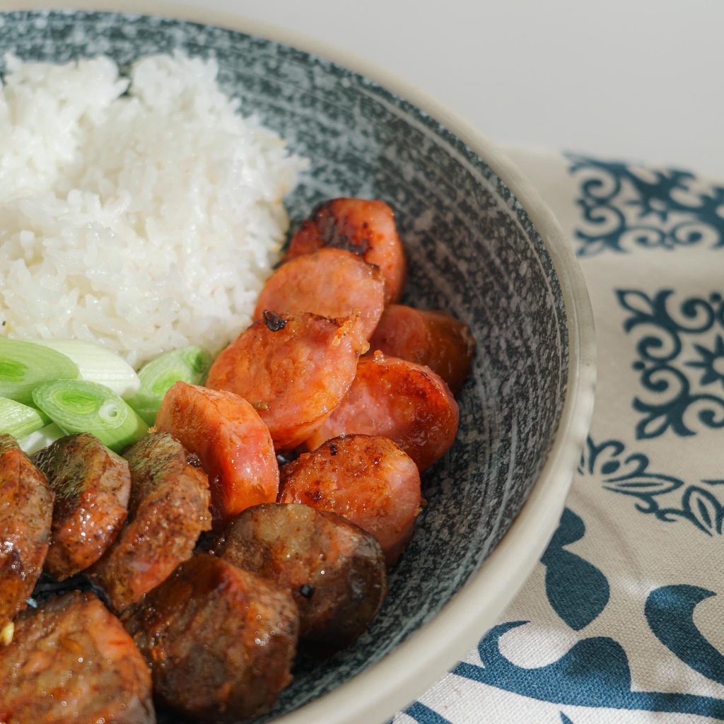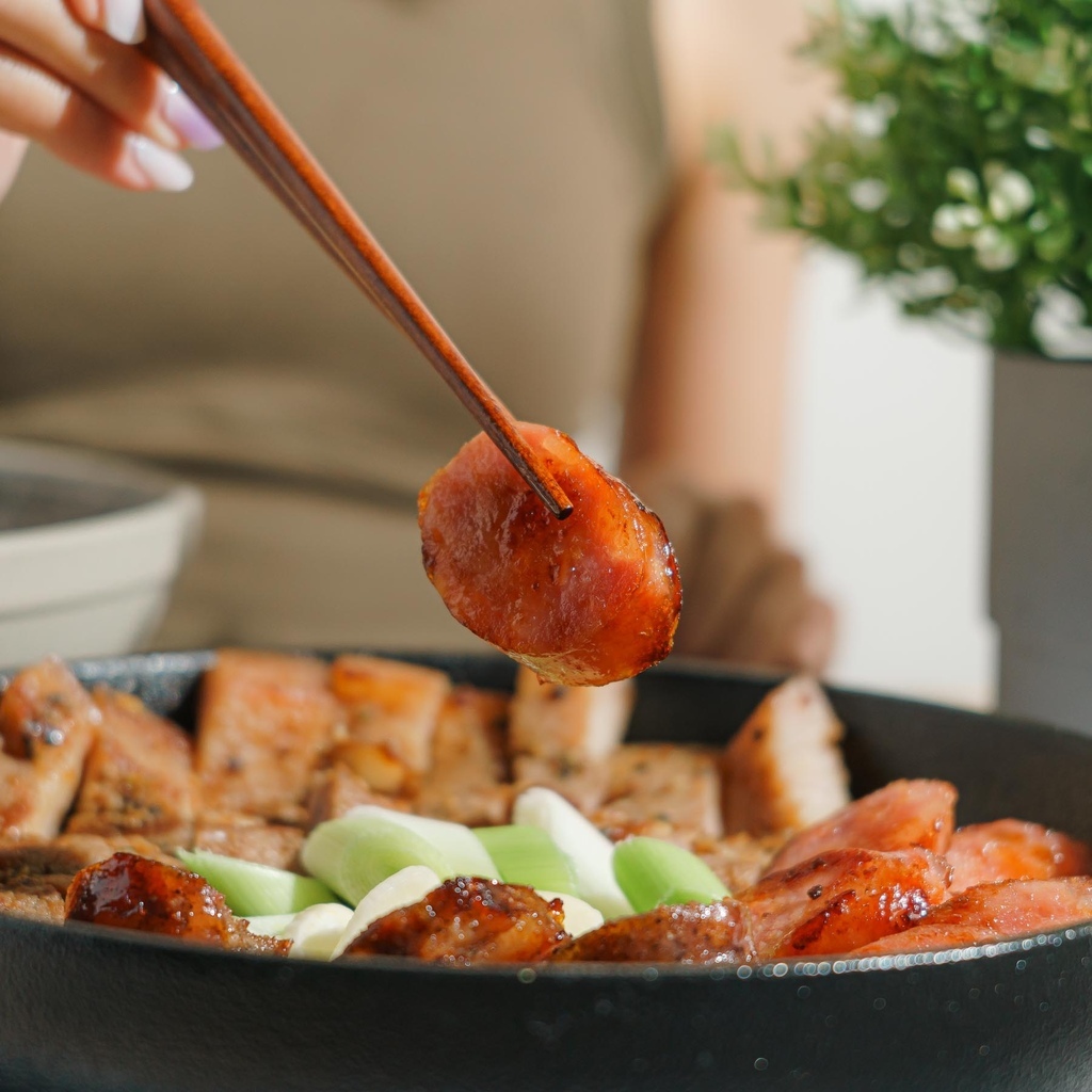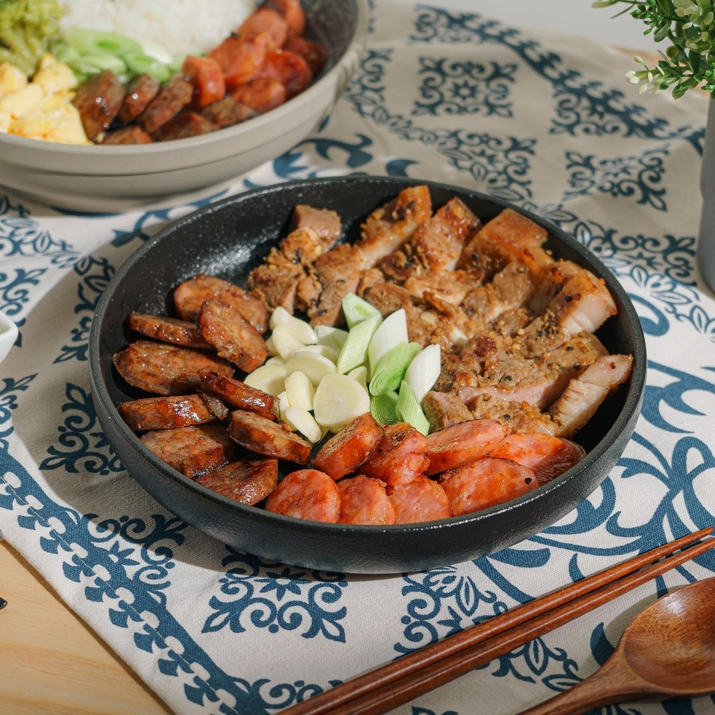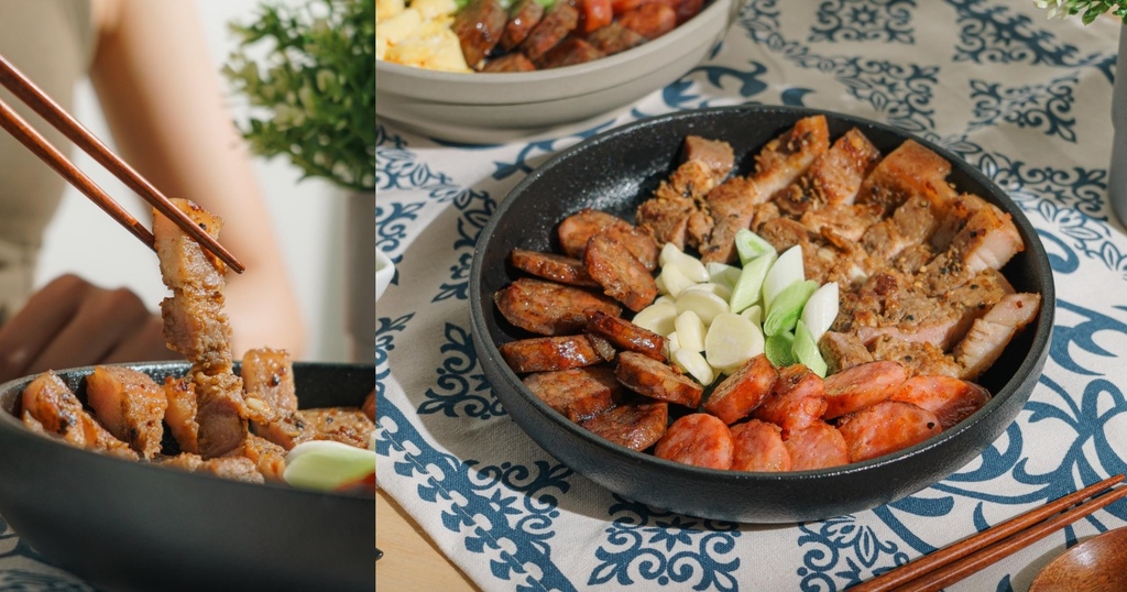 我們當天是將香腸、鹹豬肉切片後,配上蒜苗和大蒜片吃,搭飯變成便當配菜也很不錯
