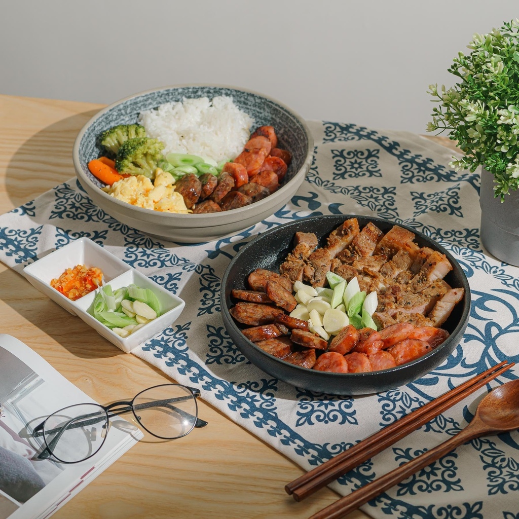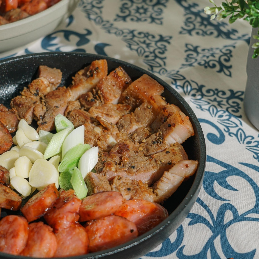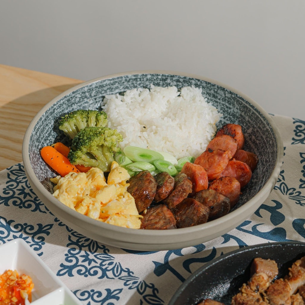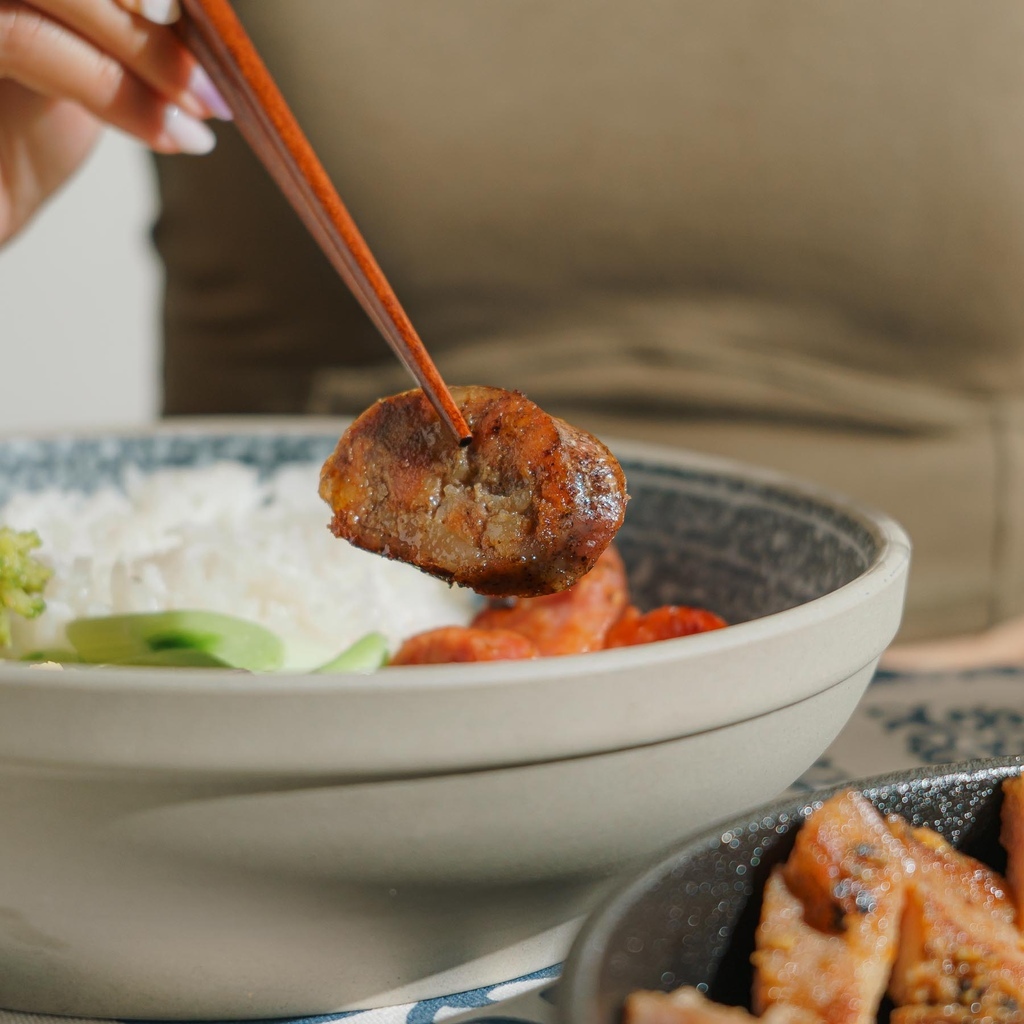我們當天是將香腸、鹹豬肉切片後,配上蒜苗和大蒜片吃,搭飯變成便當配菜也很不錯
