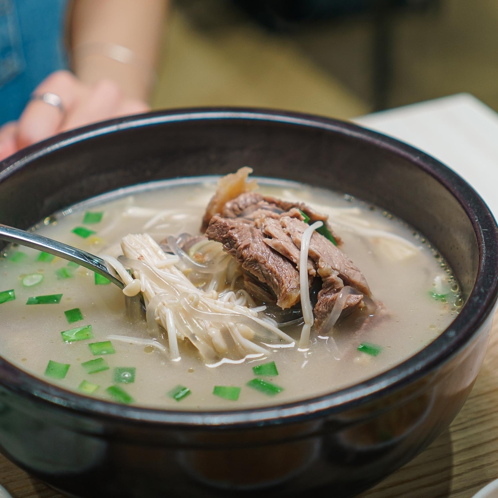 雪濃湯是因為其乳白色的湯頭而命名,以牛骨、牛肉熬製