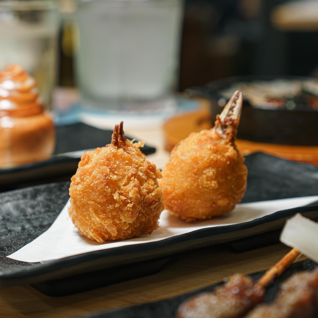 飯糰先炸後再烤,將醬汁的香氣烤出~且炸過後的米粒脆脆的很有口感