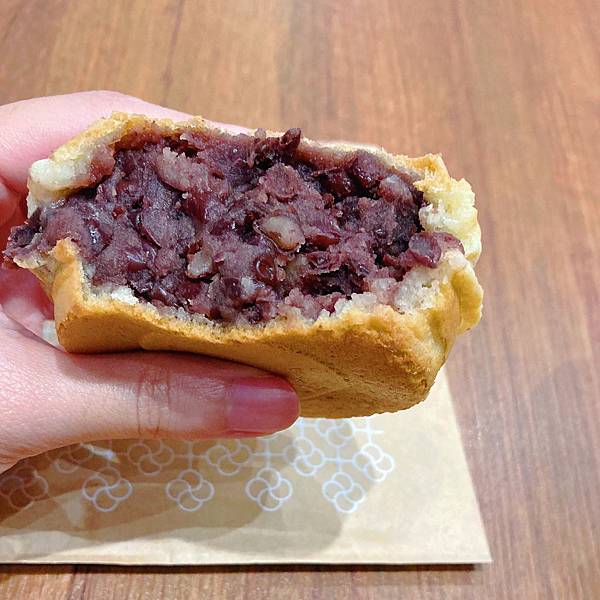紅豆是我最愛的基本款,所以就由他先開始,他實在是厚到很不合理,當下一直在想要怎麼吃,總之就直接咬吧!但不知道是我嘴太小還是他太大,就完全無法一口咬….