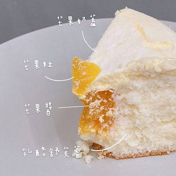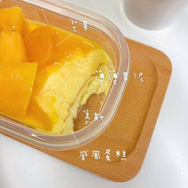 最上層是新鮮芒果、第二層是芒果果泥、第三層是芒果慕斯、基底則是戚風蛋糕
