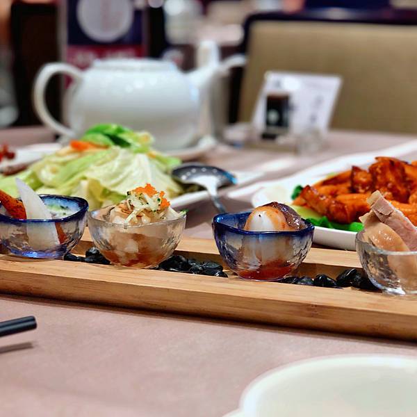 前菜我們選了烏魚子、水梨干貝、五味軟絲、花雕醉雞