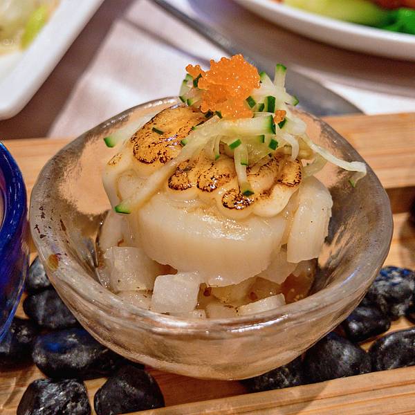 干貝上方有炙燒過的沙拉醬,還有絲絲的小黃瓜和蝦卵,下方是水梨切塊
