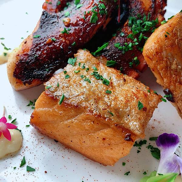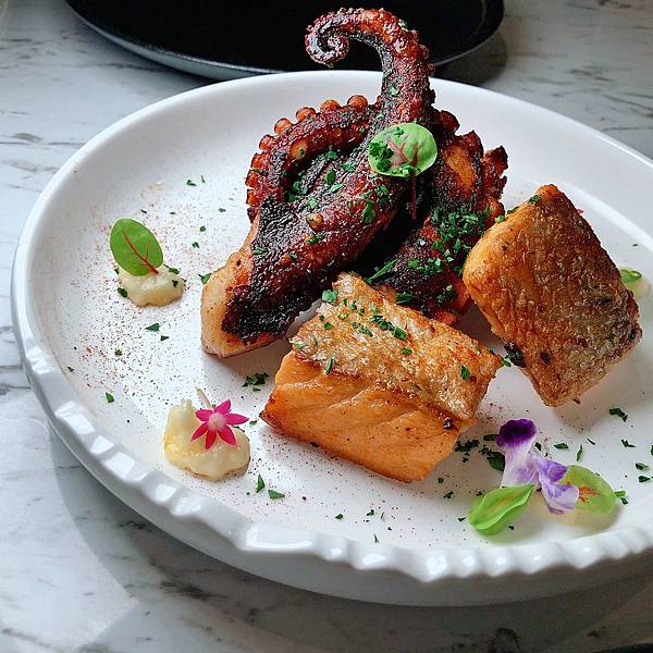 蒜味炙燒章魚搭配香煎鮭魚塊 NT.320 不客觀推薦 ★★★★✩