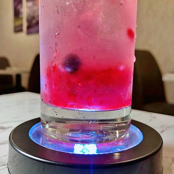 飲品下方是一個發光杯座,在昏暗餐館中替飲料打光!非常有Fu