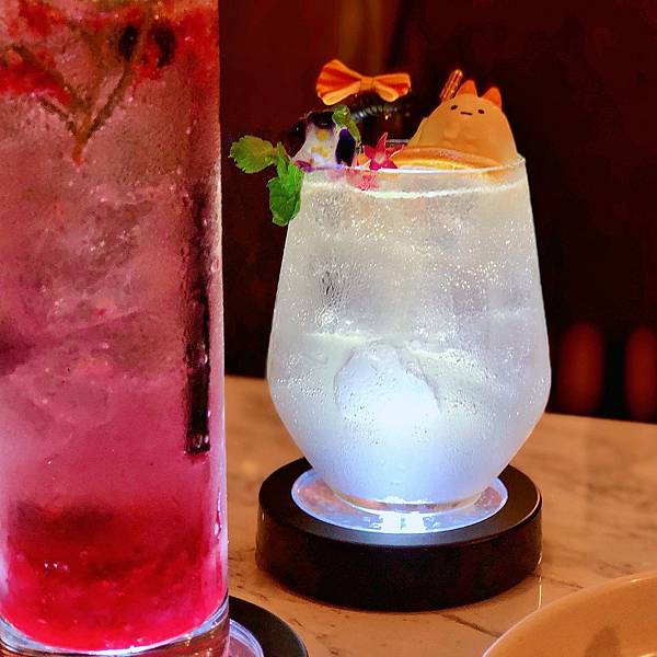 他們的調酒華麗又好喝,頂部有一隻不明動物糖霜坐在柑橘片上(好似角落生物很可愛)