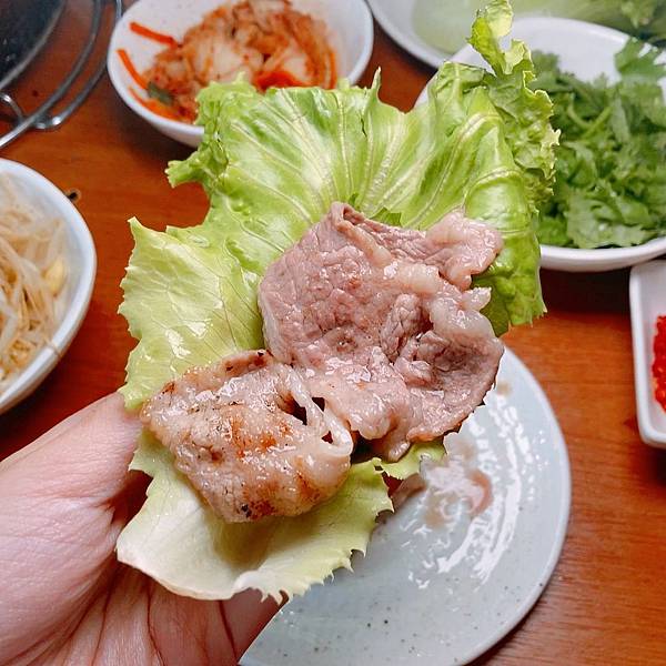 店員推薦的包法我也超愛,首先拿一大塊生菜,先撲滿一層香菜和放入適量的辣椒