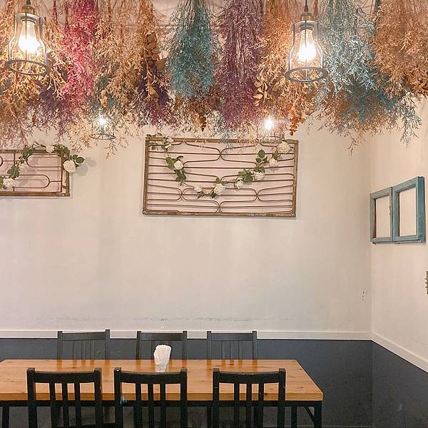 店內天花板上充滿淡香乾燥花,坐在下面吃飯拍張照,覺得可以躋身網美一族了