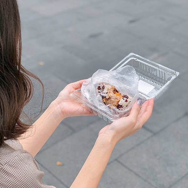 熊貓外送都會有一個透明塑膠盒裝,所以不用擔心飯糰在外送途中掉出來或是不乾淨