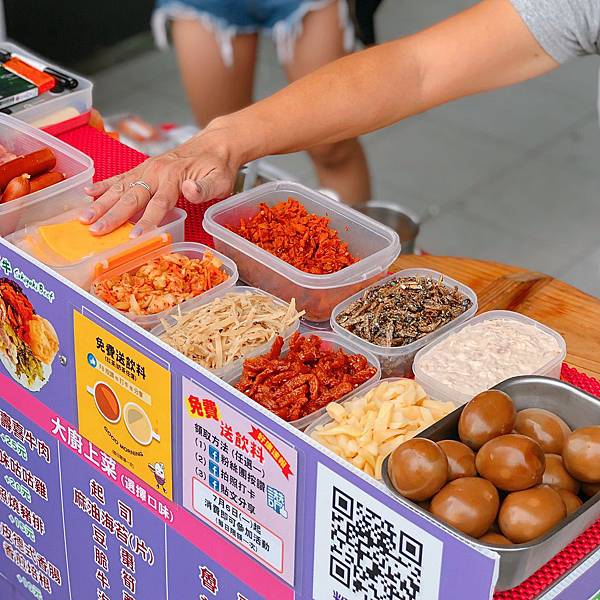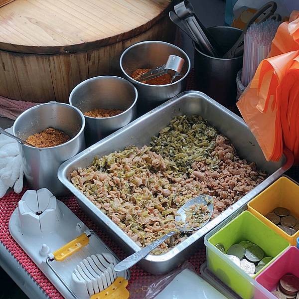 品項有培根、德式香腸、高鈣起司、菜脯(辣/不辣)、脆筍、小魚乾、牛蒡、泡菜、鮪魚、滷蛋