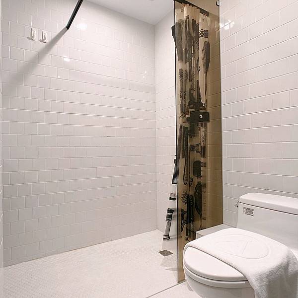 廁所全部是白色磁磚,很舒服乾淨的空間,但僅用塑膠簾作為乾濕分離的分界,地板還是會濕