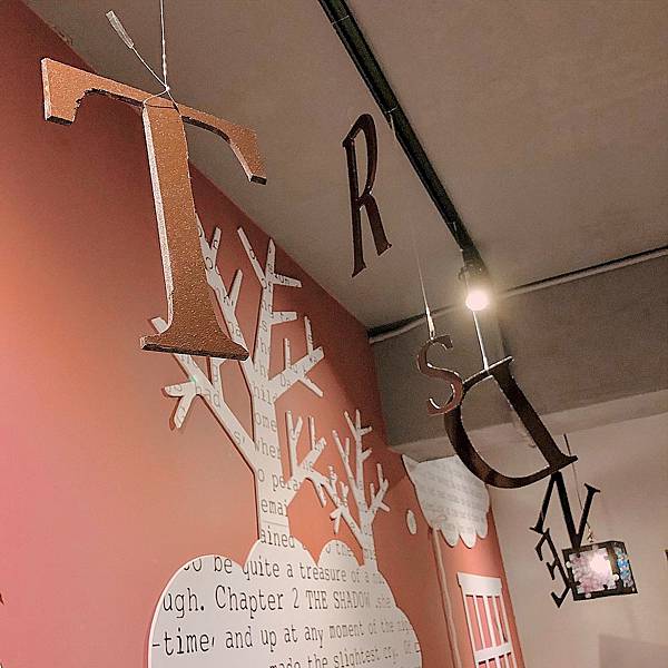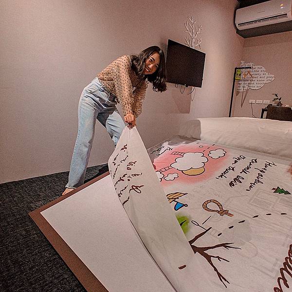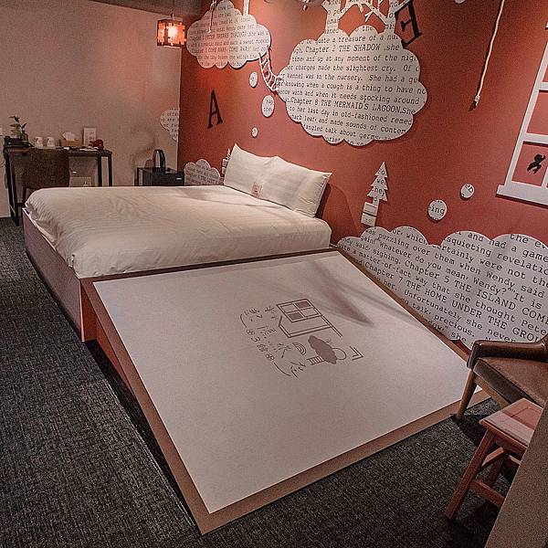 這是一間活動期間特別裝潢的房間,到處貼滿字母,床邊還弄了書的封面,讓人有睡在書裡的想像