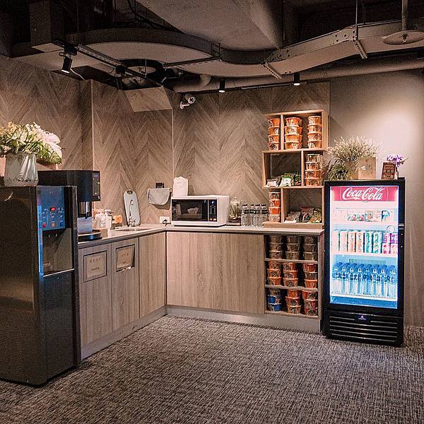 大廳中有餐飲區,除了有咖啡機可自行沖泡、飲料無限用,居然還有泡麵!想吃就泡,實在讓人眼睛為之一亮