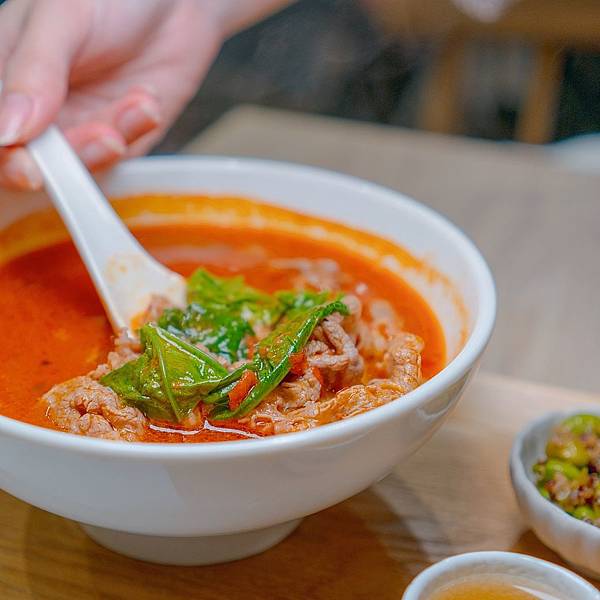 最後僅擷取上層辣油精華拌入麵中!原本辣度是小辣,但辣會疊加,越吃越辣但頗香麻