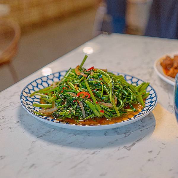 簡單淋上蝦醬拌炒的空心菜,維持蔬菜原有的清脆,鹹香不油膩,辣度低且不疊加!