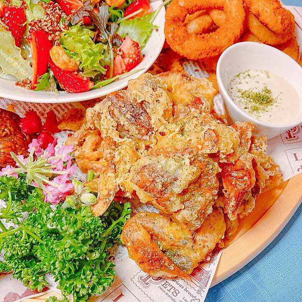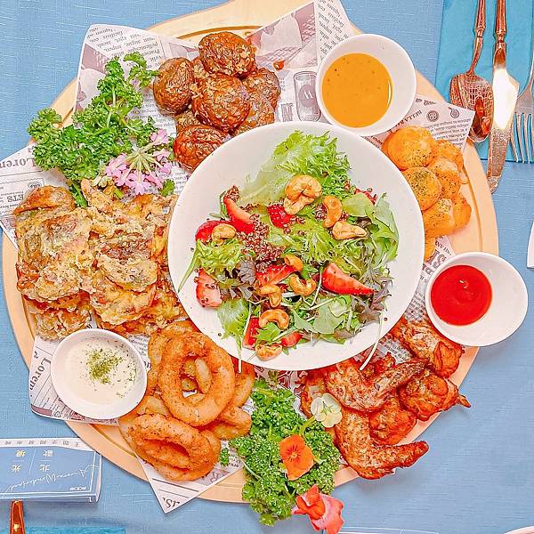 四周有蒜香蘑菇、酸辣雞翅、酥炸軟殼蟹、馬鈴薯起司球、洋蔥圈