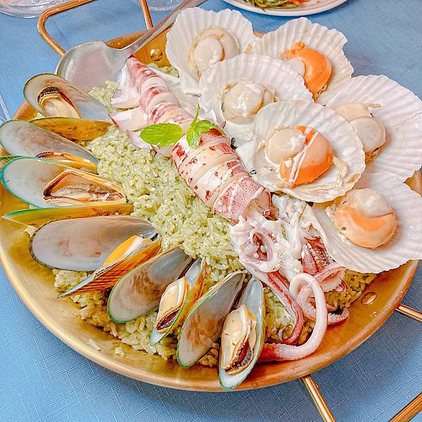 主要基底是菠菜豐厚的燉飯,撲滿餐盤的貝類、中卷