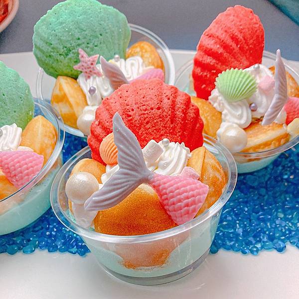 粉紅、草綠的貝殼馬德蓮和美人魚尾,擠上些許白綿奶油