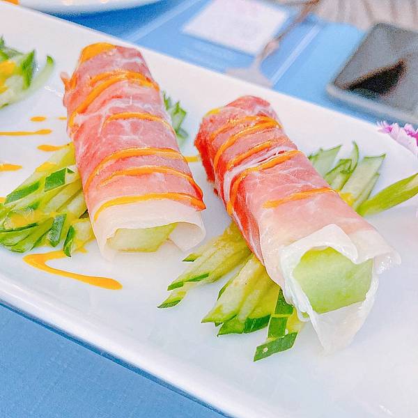 底層鋪滿絲絲小黃瓜,火腿裹著哈密瓜條,最後淋上酸甜的醬汁