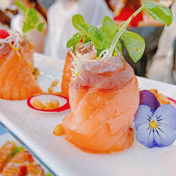 鮭魚醃漬過偏鹹但和頂端的苜蓿芽達到剛好的平衡
