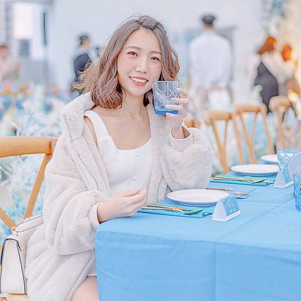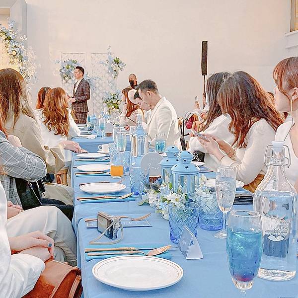 羅列藍色系長桌,放置低調玫瑰金、藍水晶餐具與鄉村風燭台