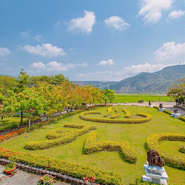 從景觀台放眼望去,一大面綠油油和些許花點綴的草坪