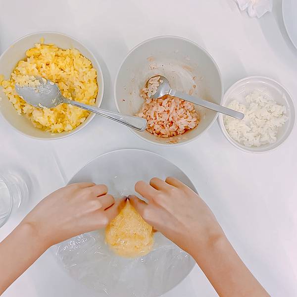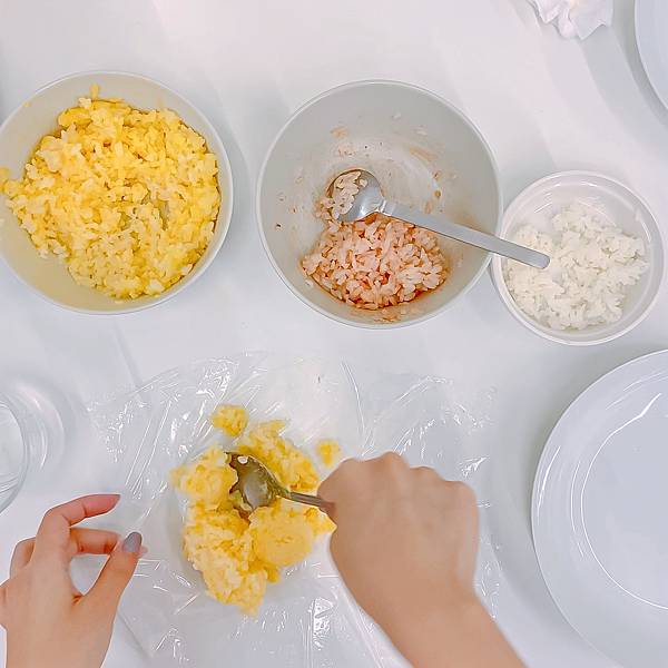 飯涼後,利用保鮮膜捏出造型後再放入盤中