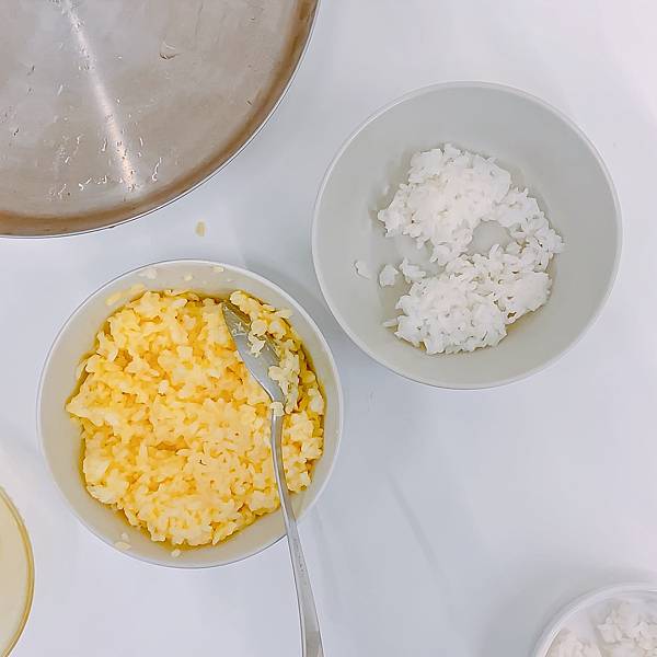 飯剛起鍋時,將「蛋黃」倒入飯中,利用飯的餘溫讓蛋熱熟