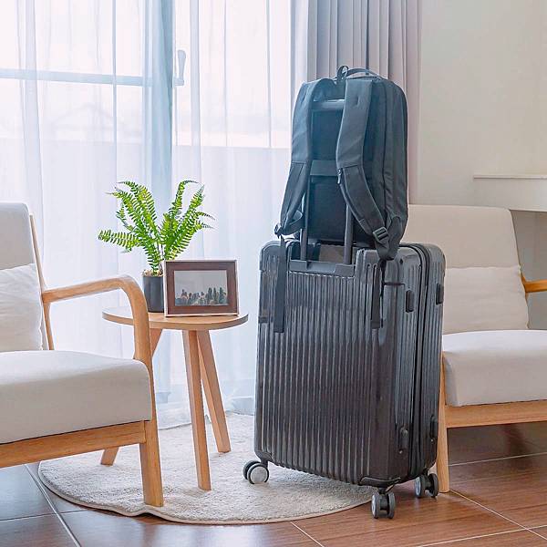 背側有行李的掛帶,可套入行李箱的把手中