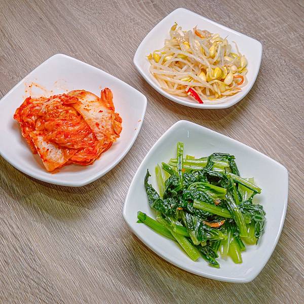 安妞每桌都會附三盤小菜,泡菜只能續一次,另外兩道可以無限續