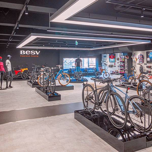 2樓是寬敞的BESV實踐旗艦店,為台灣設計、台灣製造的智慧動能自行車