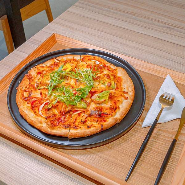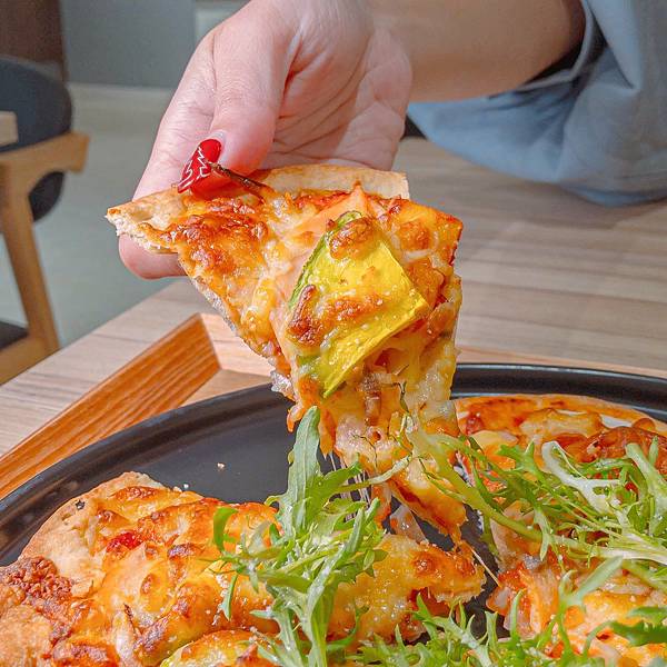 披薩是薄餅皮的,帶有脆感、不會越吃越乾