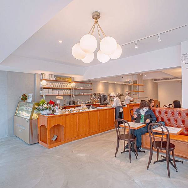 店內空間寬敞,除大面積白與地上的水泥灰外