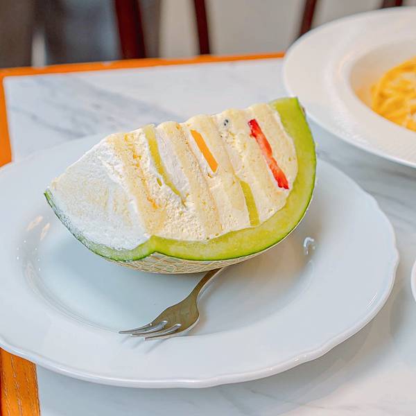 哈密瓜蛋糕是蜂蜜蛋糕、塗抹鮮奶油再夾層水果,放在哈密瓜中還會有果香