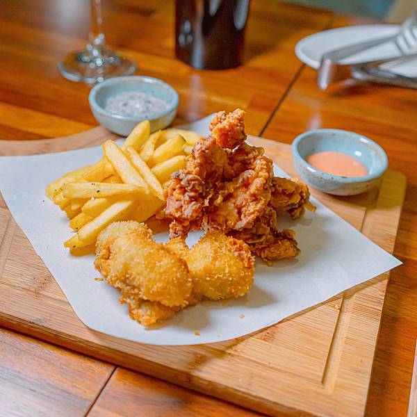 炸物拼盤是薯條、炸雞肉還有炸牡蠣!!!旁邊配上一個是松露醬