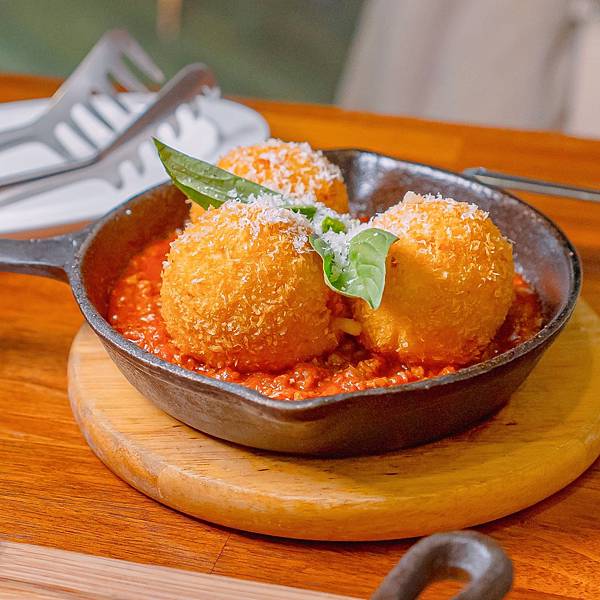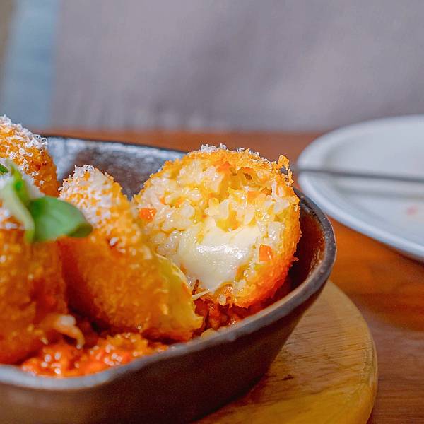就是道燉飯的變型體!奶油燉飯揉成圓體並裹滿蛋液和麵包粉油炸