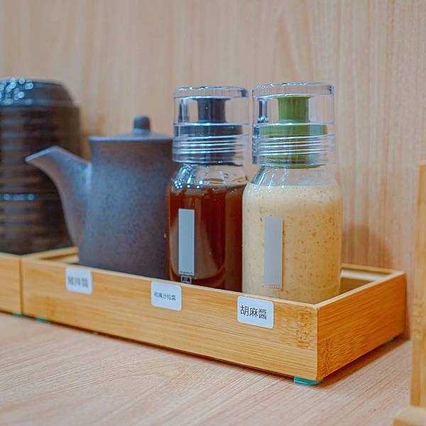 每桌都會有和風沙拉醬與胡麻醬,等等可以淋在高麗菜絲上,另外有豬排醬及麥茶