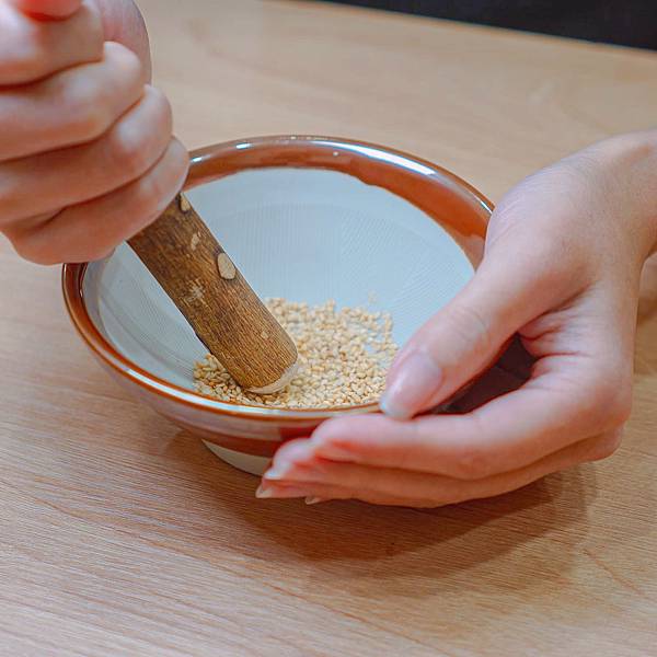 上餐前會提供一碗芝麻,可以搗磨一半左右,保留部分芝麻粒