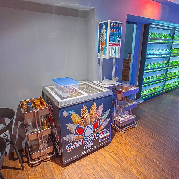 他們的霓虹龍蝦和旁邊一面的啤酒牆好搭,很有韓國夜店風格