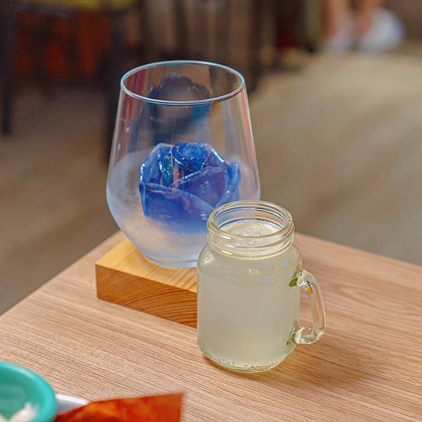 一杯裝入蝶豆花的冰玫瑰,另外一小杯伏特加及檸檬
