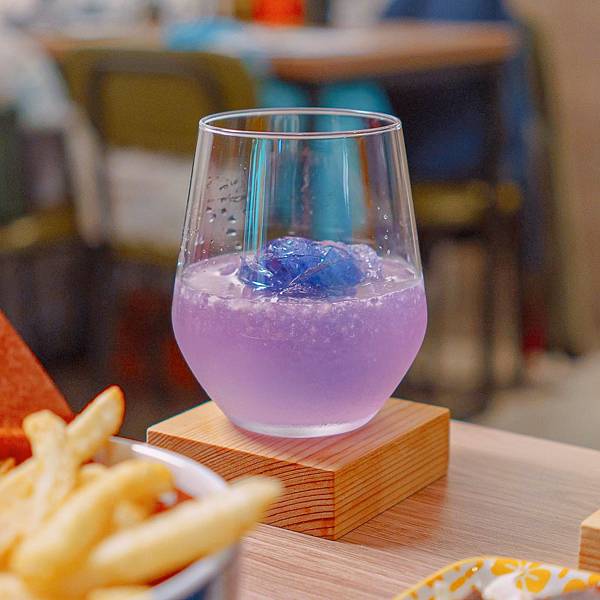 混入後立刻變成粉嫩紫色,喝起來偏酸甜、酒感沒有太重