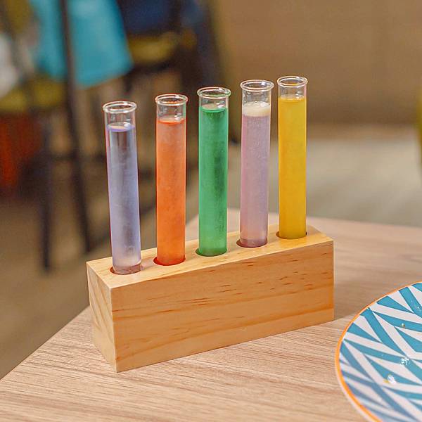 顏色好美~從左至右是蝶豆花、草莓、薄荷、蝶豆花、百香果