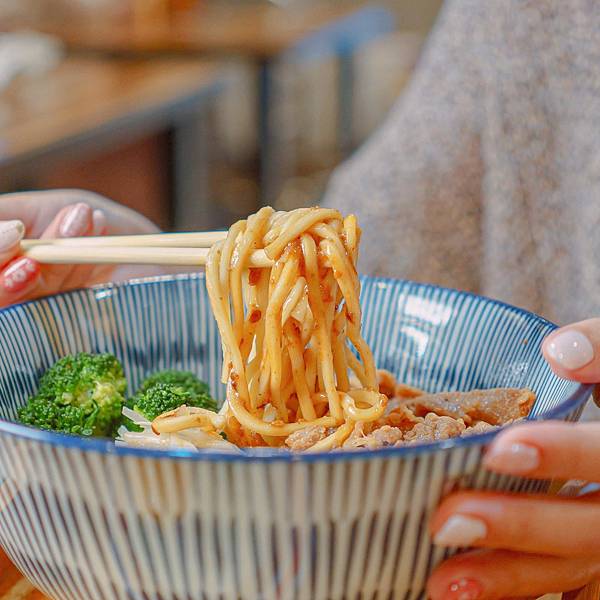 麵條Q彈有勁,緊緊扒著鹹香的醬汁,再加點辣更是對味