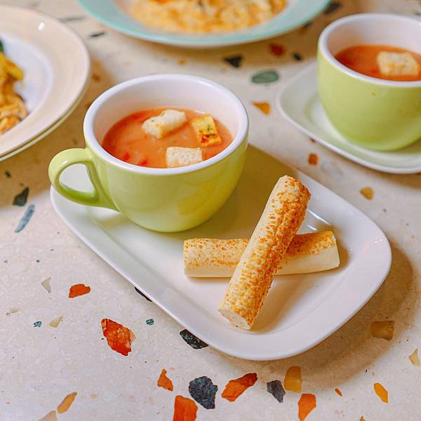 今天的濃湯是番茄羅宋湯,湯裡加入了大蒜麵包塊