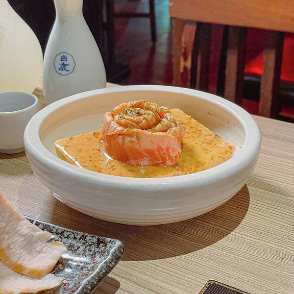 底部則是雞蛋豆腐淋入滿滿胡麻醬~綿滑的豆腐及炙燒過後鮭魚的油脂香
