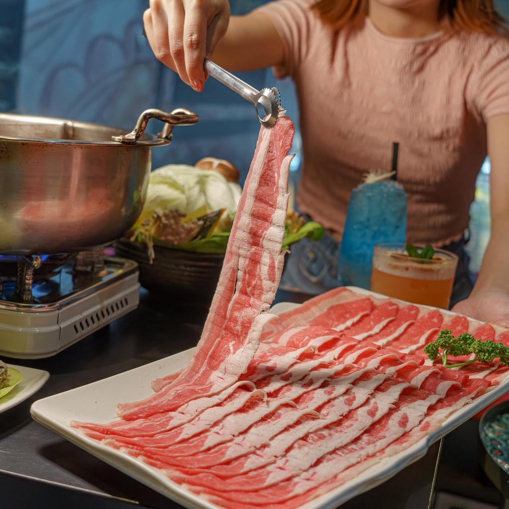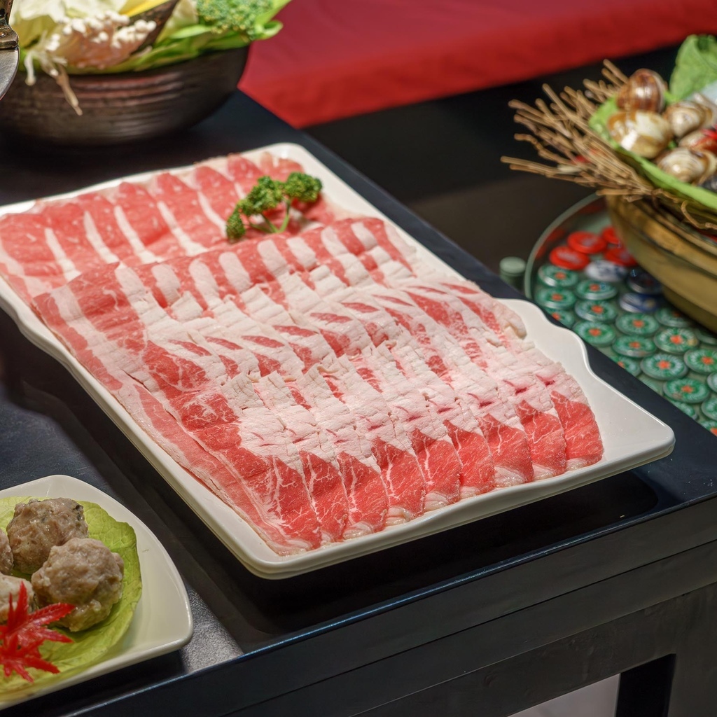 雪花牛有豐富的油脂香氣,搭著微辣與麻感的湯底