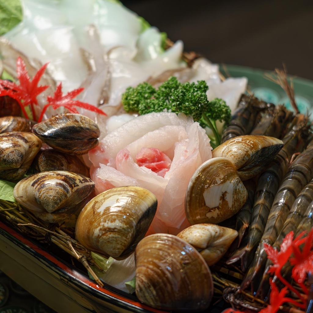 蛤蜊、鮮甜軟絲、海草蝦14隻、魚花捲